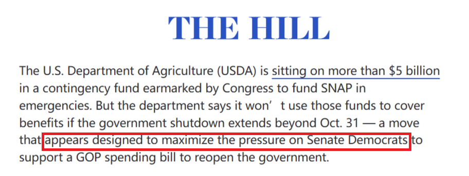 對(duì)此,美國(guó)《國(guó)會(huì)山報(bào)》直言,農(nóng)業(yè)部種種說(shuō)辭顯然為了最大限度地向參議院民主黨人施壓,迫使他們支持共和黨的支出法案,以重啟政府。