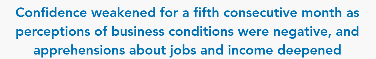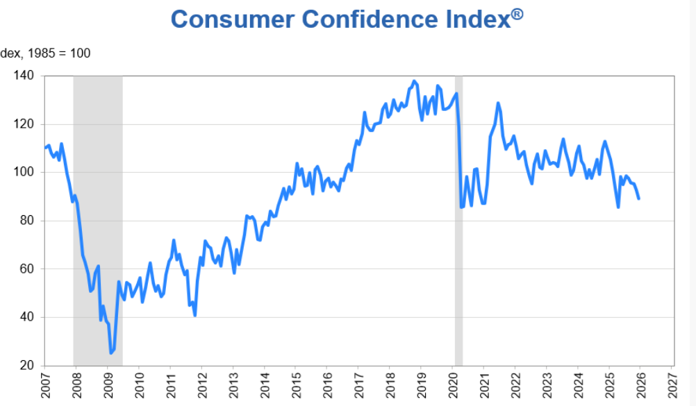 美國研究機(jī)構(gòu)世界大型企業(yè)研究會12月23日發(fā)布的初步調(diào)查數(shù)據(jù)顯示,由于對商業(yè)環(huán)境看法負(fù)面,對就業(yè)和收入的擔(dān)憂加劇,美國12月份消費(fèi)者信心指數(shù)從11月份修訂后的92.9進(jìn)一步下滑至89.1,連續(xù)第五個月走低,為今年4月以來的最低水平。