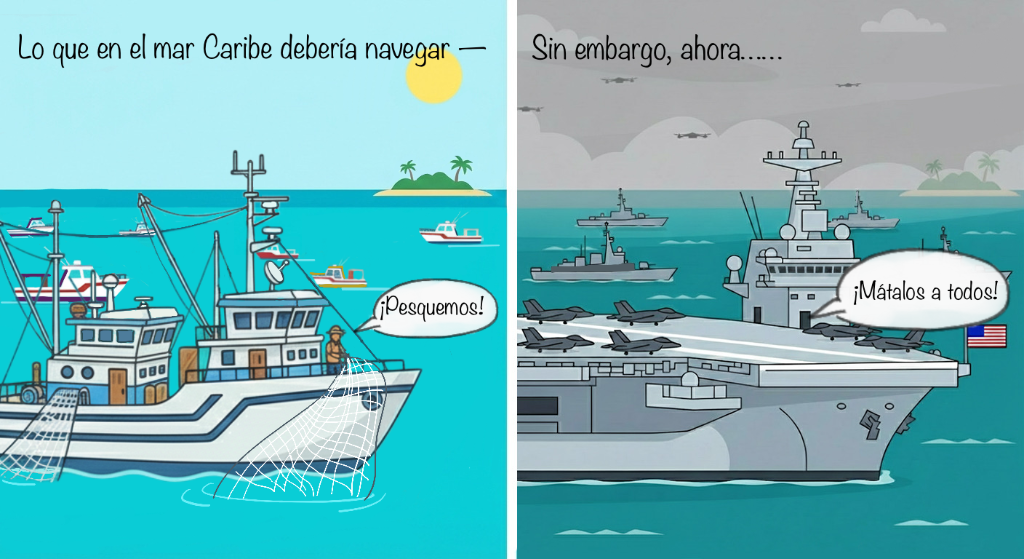 漫畫《“加勒比海盜”》。畫面左側(cè),航行在加勒比海上的本該是收獲滿滿的漁船。但在畫面右側(cè),現(xiàn)如今的加勒比海陰云密布、軍艦成群,回蕩著美軍“不留活口”的口號。