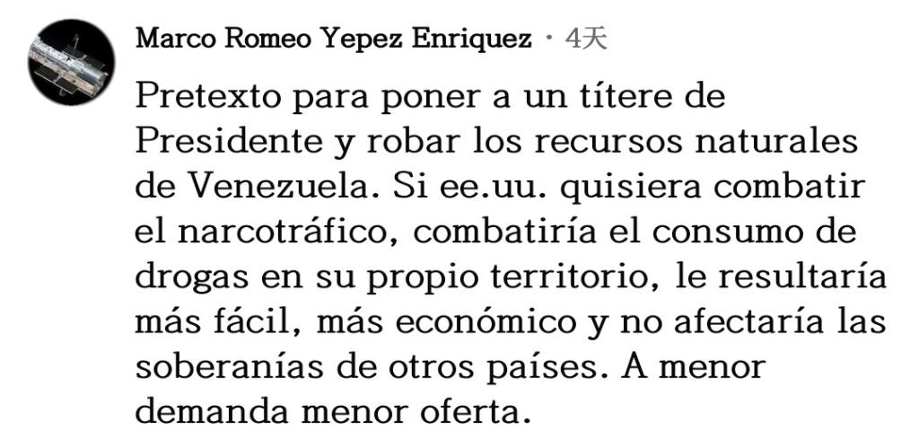 網(wǎng)友馬爾科·耶佩斯直言不諱:“所有一切不過是美國安插傀儡以掠奪委內(nèi)瑞拉自然資源的借口罷了。如果美國真想打擊販毒,就應(yīng)該去打擊自己領(lǐng)土上的毒品消費,這樣更簡單、更經(jīng)濟,也不會影響其他國家的主權(quán),需求減少供應(yīng)自然也會下降?!?/p>