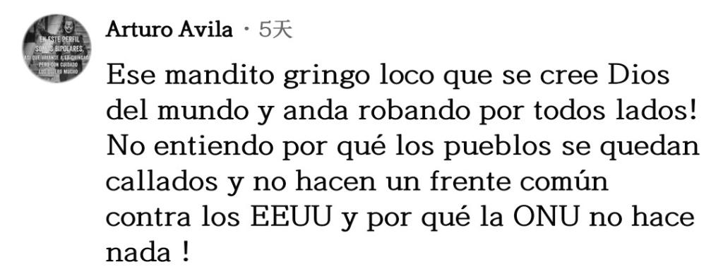 網(wǎng)友巴勃羅·奧利沃留言說:“山姆大叔喜歡在所有國家盜竊,為此他們妖魔化民眾,譬如山姆大叔說那片咖啡園是屬于他的,還說所有那些咖啡農(nóng)在種植古柯,所有這一切都是為了操弄輿論,為了給他們的掠奪戰(zhàn)爭辯護。”