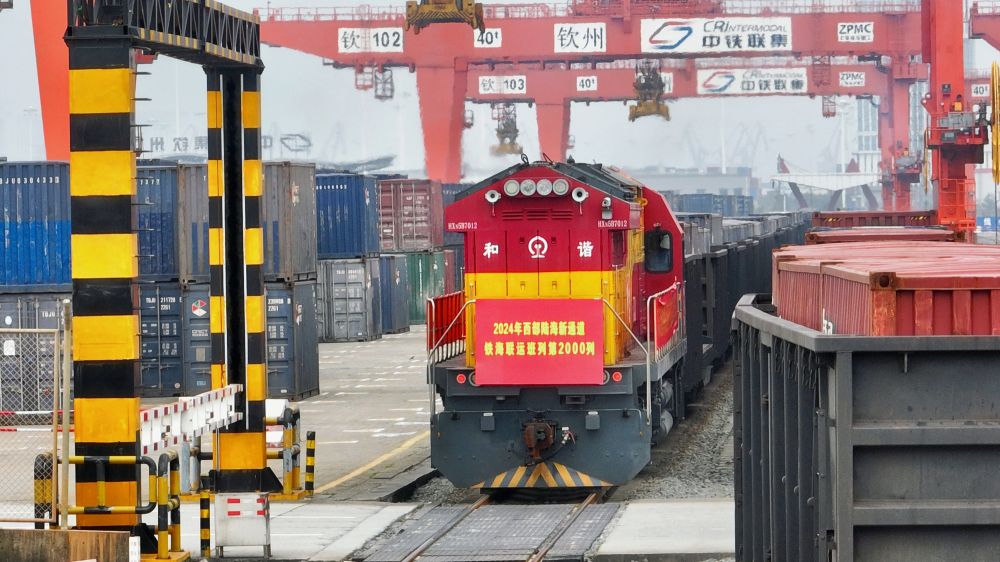 3月17日上午,一列滿載緬甸黑芝麻、海南椰子汁、廣西白糖等貨物的海鐵聯(lián)運班列,從欽州鐵路集裝箱中心站緩緩發(fā)出駛向四川城廂站。這是2024年西部陸海新通道開行的第2000列海鐵聯(lián)運班列,同比增長16.8%,提前14天完成一季度班列開行任務。