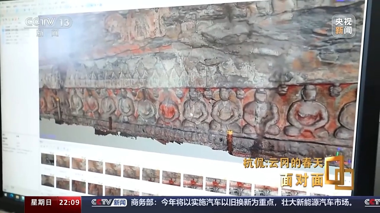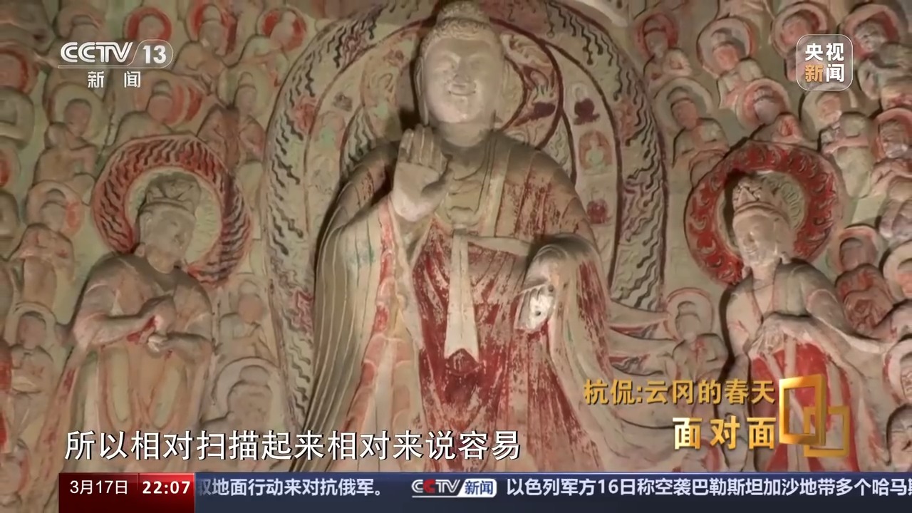 杭侃:因?yàn)槎鼗推鸩皆?,到現(xiàn)在都是我們學(xué)習(xí)的榜樣。但是敦煌它正是因?yàn)槠鸩皆?,可能我們現(xiàn)在技術(shù)迭代比較快。所以從技術(shù)迭代的角度來(lái)說(shuō)我們并不落后。我們現(xiàn)在的精度已經(jīng)到了0.03毫米了,但是那樣需要的算力是非常大的。我們這有一個(gè)超算中心,超算中心是什么概念?就是你看到的一個(gè)洞窟的運(yùn)算能力,要和一個(gè)中等城市的,我們叫智慧城市,那個(gè)量是一樣的。云岡它是一個(gè)皇家工程,所以那個(gè)像都特別大,敦煌它很多洞窟比較小,另外敦煌它的壁畫(huà)非常精彩,但是壁畫(huà)是二維的,所以相對(duì)掃描起來(lái)相對(duì)來(lái)說(shuō)容易,但是我們這個(gè)地方它一個(gè)是大,第二個(gè)就是雕刻的手法多。所以像你看到的第六窟,我們到現(xiàn)在都沒(méi)有拿得出來(lái),大家都能認(rèn)可的采集方案。