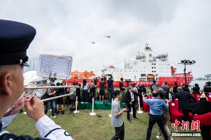 這次,香港更是以“海陸空”上陣歡迎“雪龍2”號(hào)到訪香港。在“雪龍2”號(hào)不遠(yuǎn)處,兩艘拖船和一艘消防船在碼頭附近對(duì)射水柱,形成水拱門(mén)。香港飛行服務(wù)隊(duì)的直升機(jī)飛過(guò)維多利亞港上空示意致敬,香港警察銀樂(lè)隊(duì)在現(xiàn)場(chǎng)奏樂(lè),九龍巴士車隊(duì)貼上歡迎“雪龍2”號(hào)標(biāo)志,還有舞獅隊(duì)歡迎“雪龍2”號(hào)來(lái)到香港。