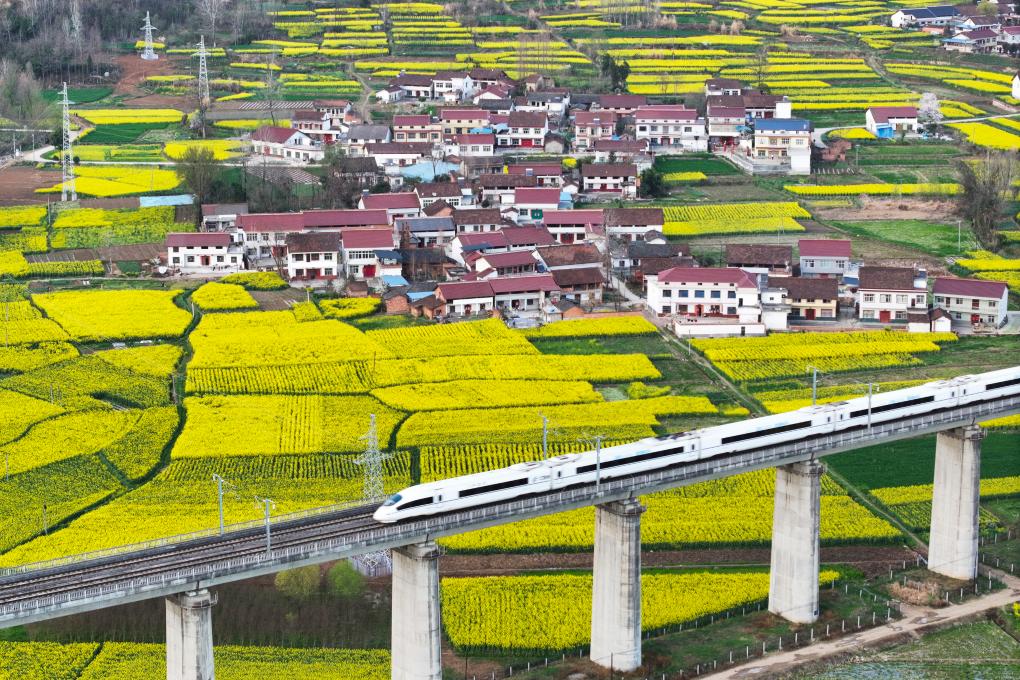 3月20日,西成高鐵線上的列車駛過(guò)陜西漢中市南鄭區(qū)陽(yáng)春鎮(zhèn)(無(wú)人機(jī)照片)。新華社記者 邵瑞 攝