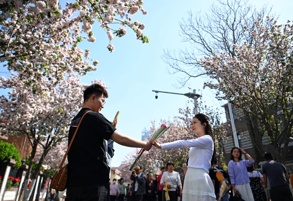 游人在天津市和平區(qū)五大道漫步賞花(4月10日攝)。