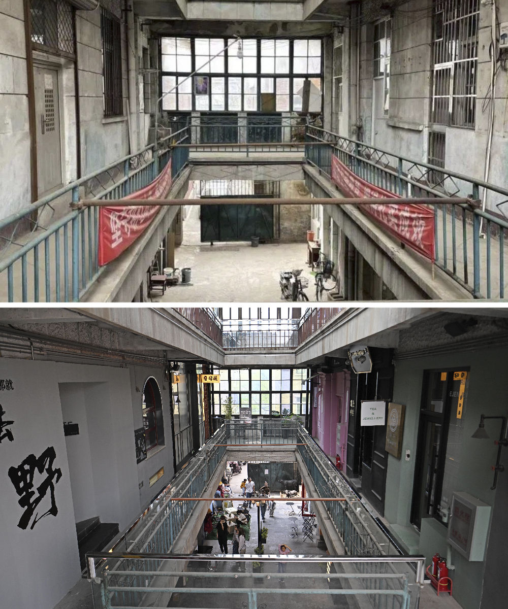 拼版照片:上圖是五大道重慶道225號(hào)廢棄廠房內(nèi)景(資料照片);下圖是修繕后的五大道重慶道225號(hào)創(chuàng)意街區(qū)(4月13日攝)。