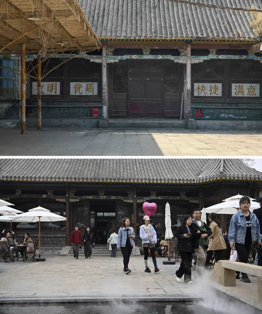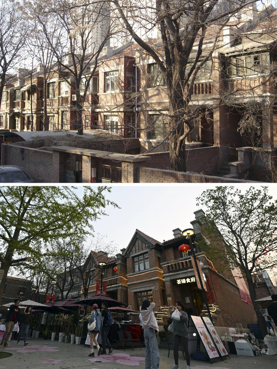 拼版照片:上圖是改造前的先農(nóng)大院(資料照片)。下圖是游客在位于五大道的先農(nóng)大院內(nèi)游覽(4月6日攝)。始建于1925年的先農(nóng)大院是五大道建成最早的建筑群之一,融合了英式聯(lián)排住宅、英式獨(dú)棟別墅等多種特色的建筑風(fēng)格。歲月變遷,這些建筑一度損壞嚴(yán)重,配套設(shè)施老化。2006年起,天津啟動(dòng)先農(nóng)大院整理項(xiàng)目,對街區(qū)居民進(jìn)行了騰遷,對建筑進(jìn)行了加固修繕,恢復(fù)了街區(qū)的歷史原貌,引進(jìn)了餐飲、文化展示、辦公等業(yè)態(tài),使這里形成了環(huán)境優(yōu)雅的公共藝術(shù)和展示建筑遺產(chǎn)的城市新空間。