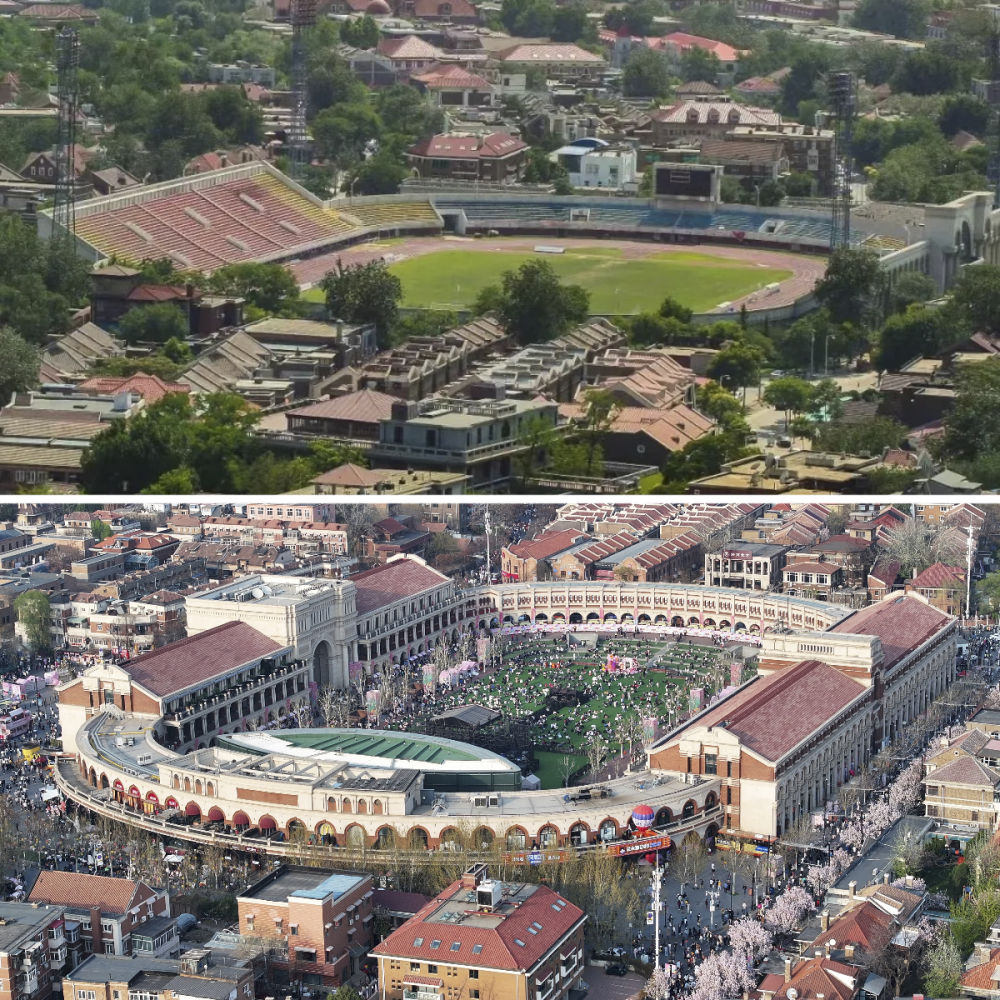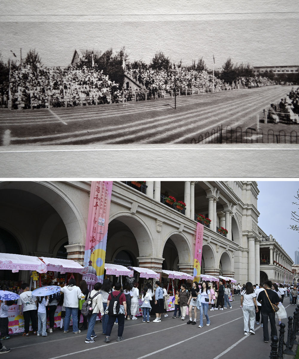 拼版照片:上圖是位于五大道的民園體育場(資料照片);下圖是位于五大道的民園廣場(4月6日攝)。民園廣場的前身是始建于1920年的民園體育場,這里也是中國的第一個(gè)燈光足球場。經(jīng)過提升改造,現(xiàn)在的民園廣場已經(jīng)成為中西合璧的“城市會(huì)客廳”。