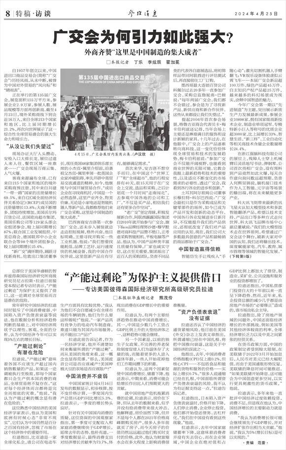 正在舉行的第135屆廣交會,展覽面積155萬平方米,參展企業(yè)2.9萬家,參展人數(shù)、展品規(guī)模等方面再創(chuàng)新高。截至4月23日,境外采購商線下到會近16萬人,來自全球213個國家和地區(qū),比上屆同期增長21.2%,再次向世界展示了這一綜合性全球貿(mào)易盛會的強大生命力和吸引力。
