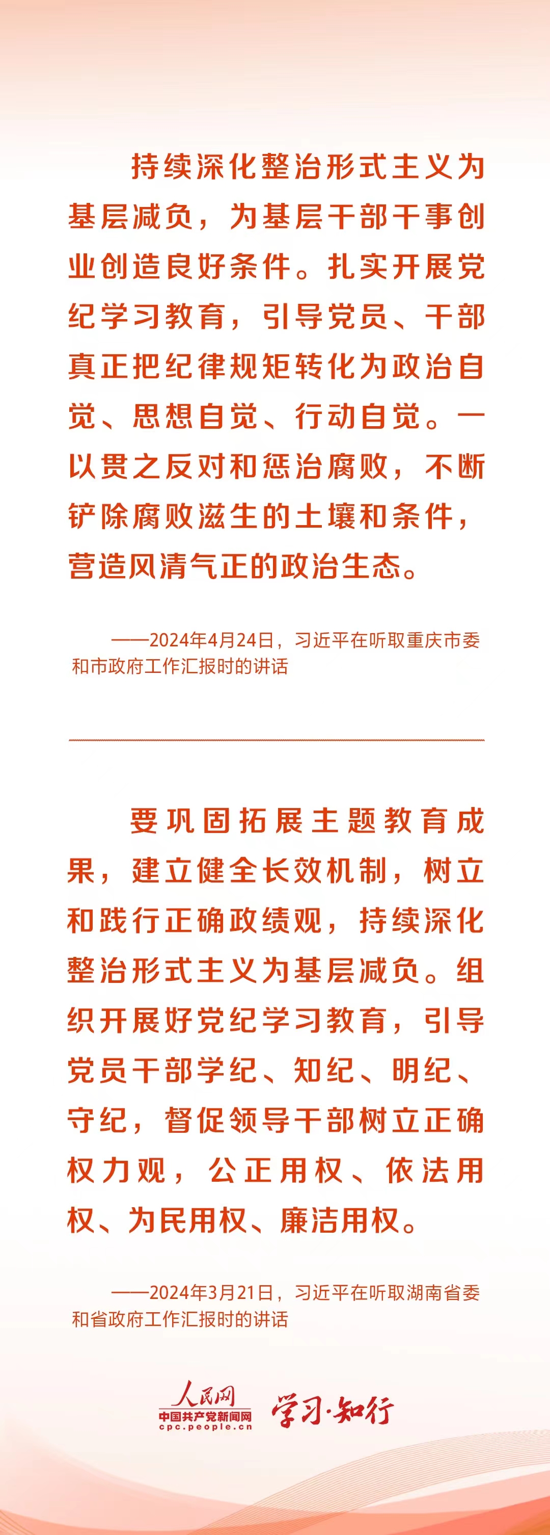在新時(shí)代推動(dòng)西部大開發(fā)座談會(huì)上,習(xí)近平再次明確,“鞏固拓展主題教育成果,抓好黨紀(jì)學(xué)習(xí)教育,持續(xù)整治形式主義為基層減負(fù)?!?/p>