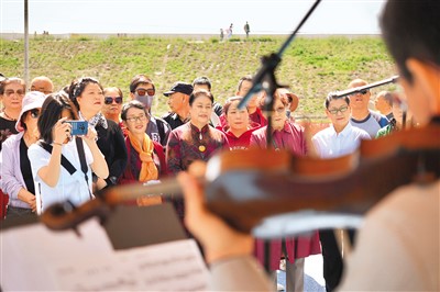 青格達(dá)湖旅游風(fēng)景區(qū)是依托“軍墾第一庫(kù)”猛進(jìn)水庫(kù)發(fā)展起來(lái)的AAAA級(jí)景區(qū)。每年春天,這里都會(huì)舉辦大型郁金香文化旅游節(jié)。4月21日上午,中國(guó)交響樂(lè)團(tuán)走進(jìn)青格達(dá)湖景區(qū),在這里上演弦樂(lè)四重奏“快閃”,精彩的演出吸引眾多市民游客前來(lái)“圍觀”,其中包括五家渠軍墾之聲合唱團(tuán)的團(tuán)員。
