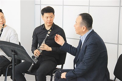 中國(guó)交響樂(lè)團(tuán)副團(tuán)長(zhǎng)、單簧管首席尹波(右一)指導(dǎo)新疆藝術(shù)學(xué)院學(xué)生。