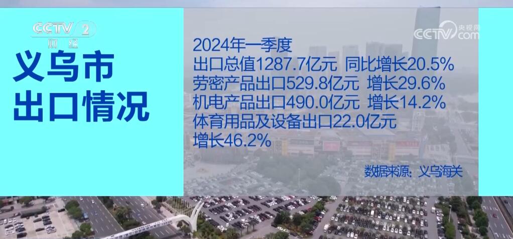 數(shù)據(jù)顯示,2024年一季度,義烏市出口總值達(dá)1287.7億元,同比增長(zhǎng)20.5%。其中,勞密產(chǎn)品出口529.8億元,增長(zhǎng)29.6%;機(jī)電產(chǎn)品出口490.0億元,增長(zhǎng)14.2%;而體育用品及設(shè)備出口達(dá)到22.0億元,增長(zhǎng)46.2%。業(yè)內(nèi)人士表示,巴黎奧運(yùn)會(huì)即將召開,以及外商圣誕采購(gòu)季開始,歐美市場(chǎng)補(bǔ)庫(kù)存需求增加,使得相關(guān)產(chǎn)品出口占比顯著提升。