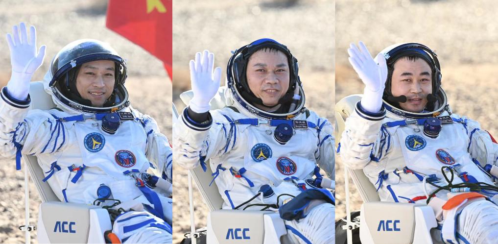 4月30日,神舟十七號(hào)航天員湯洪波(中)、唐勝杰(右)、江新林安全順利出艙。(拼版照片)