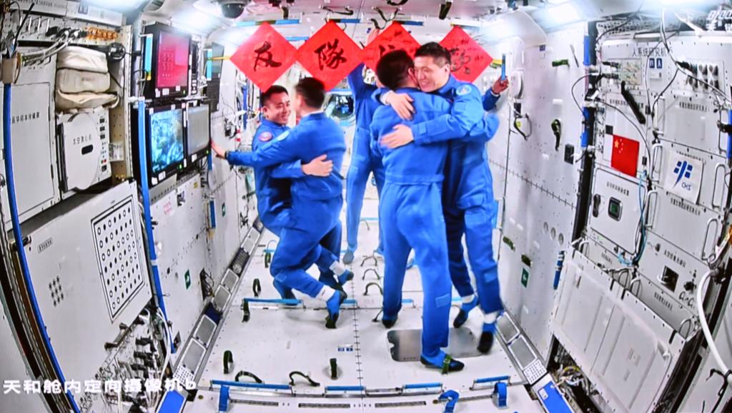 2024年4月26日5時(shí)04分,在軌執(zhí)行任務(wù)的神舟十七號(hào)航天員乘組順利打開“家門”,歡迎遠(yuǎn)道而來(lái)的神舟十八號(hào)航天員乘組入駐“天宮”。隨后,兩個(gè)航天員乘組拍下“全家?!?,共同向牽掛他們的全國(guó)人民報(bào)平安。