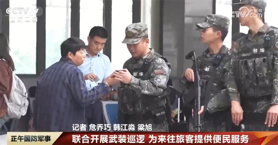 在安徽蚌埠火車站,武警官兵與公安特警聯(lián)合開展武裝巡邏,主動加大對重點區(qū)域的實時監(jiān)控和巡邏力度,在維護秩序的同時,官兵還耐心為廣大旅客答疑解惑,提供便民服務(wù)。