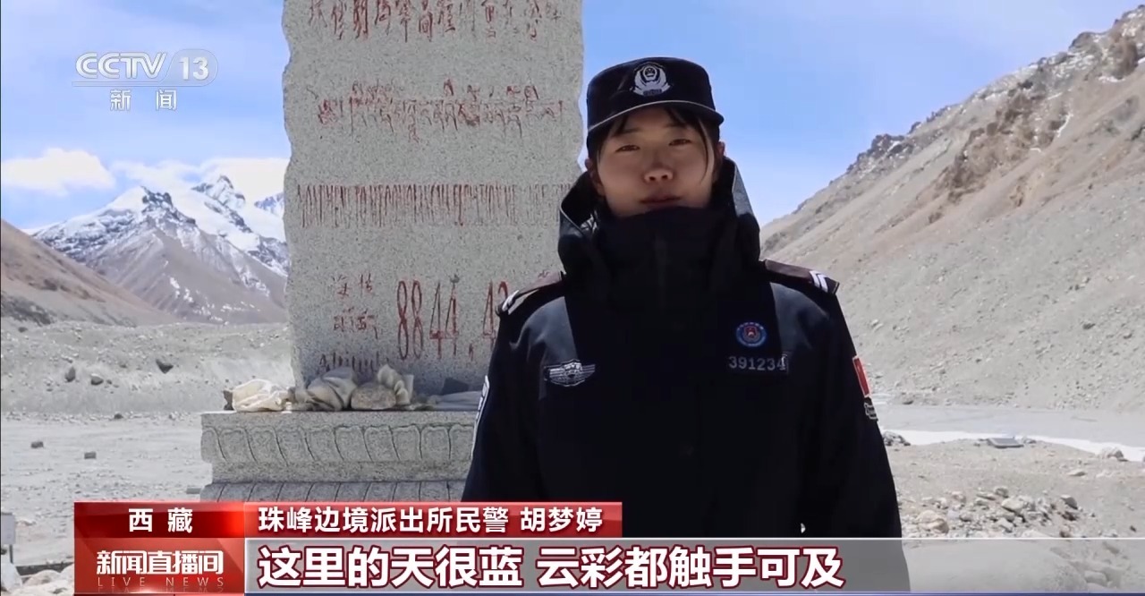 珠峰邊境派出所民警 胡夢(mèng)婷:這里的天很藍(lán),云彩都觸手可及。珠穆朗瑪峰,世界最高峰,對(duì)于我來說不再是課本上那遙不可及的存在,而是我已經(jīng)抵達(dá)并駐守的地方。