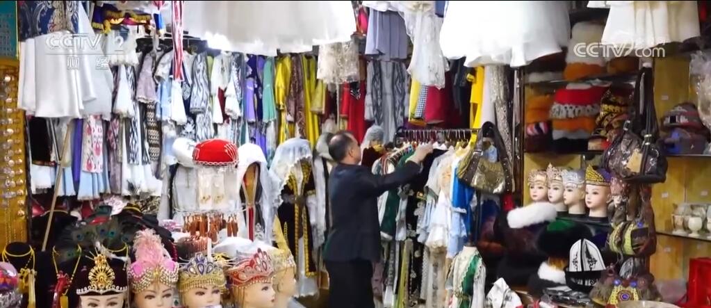在總臺(tái)2024年春晚舞臺(tái)上,演員們身穿特色服飾進(jìn)行表演,驚艷全場(chǎng)。春晚過(guò)后,慕名前來(lái)購(gòu)買(mǎi)和定制艾特萊斯服飾的游客不斷增加。努爾·買(mǎi)買(mǎi)提原本在當(dāng)?shù)亟?jīng)營(yíng)一家數(shù)碼產(chǎn)品店鋪,看到旅拍店艾特萊斯服飾等傳統(tǒng)民族服裝的租賃和定制需求增加,他便在喀什古城開(kāi)了一家民族服裝綜合店。