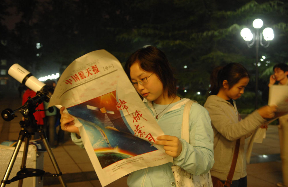 2007年10月24日,北京航空航天大學(xué)一名學(xué)生在翻看《中國航天報》號外。新華社記者 羅曉光 攝