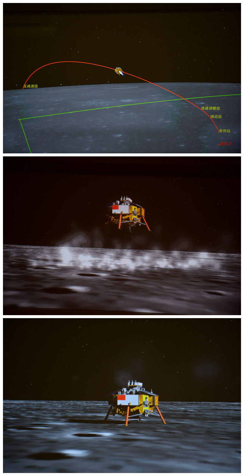 這是2019年1月3日在北京航天飛行控制中心拍攝的降落過程(示意圖)。2019年1月3日10時26分,嫦娥四號探測器自主著陸在月球背面南極-艾特肯盆地內(nèi)的馮·卡門撞擊坑內(nèi),實(shí)現(xiàn)人類探測器首次在月球背面軟著陸。新華社記者 金立旺 攝