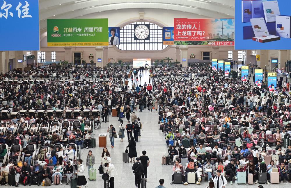 5月1日,出行旅客在哈爾濱火車站候車廳內(nèi)候車。新華社發(fā)(原勇攝)