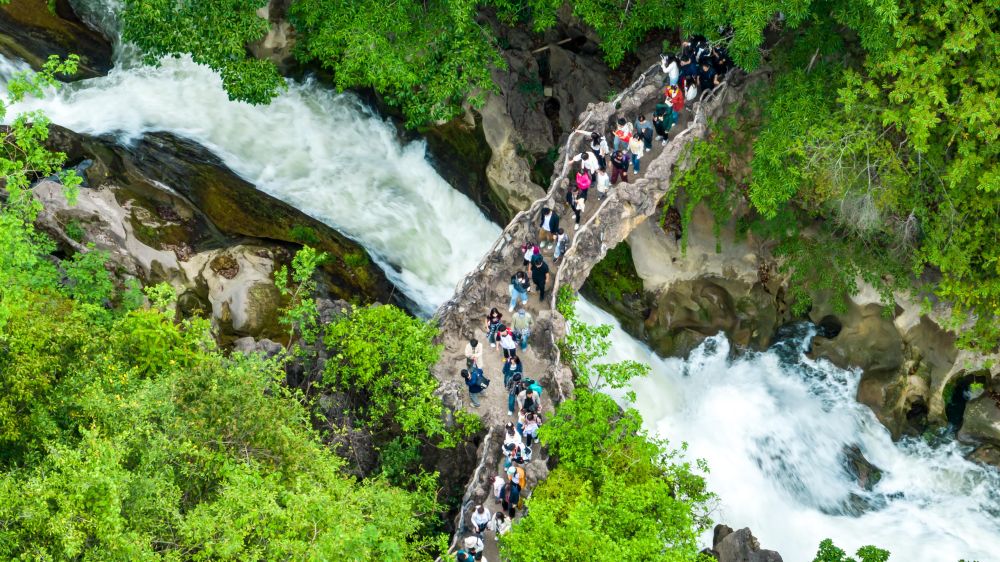 5月2日,游客在貴州省安順市天星橋景區(qū)游覽銀鏈墜潭瀑布(無(wú)人機(jī)照片)。 新華社發(fā)(陳熙 攝)