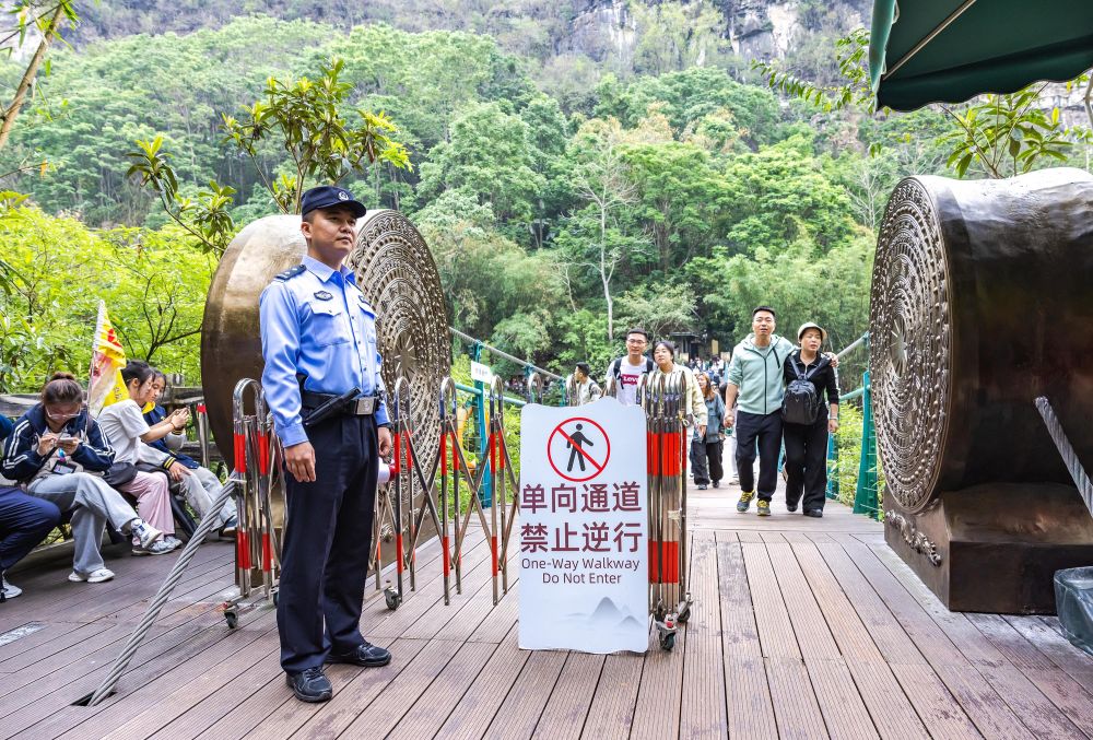 5月1日,民警在貴州省安順市黃果樹瀑布景區(qū)執(zhí)勤。新華社發(fā)(陳熙 攝)