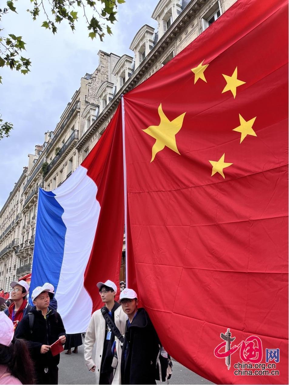 下午5時(shí)左右,習(xí)近平主席的車隊(duì)終于駛來,人群開始興奮,呼喊聲也逐漸高亢。卿馨月回憶,大家一遍又一遍地呼喊著:“歡迎,歡迎,熱烈歡迎”,不少人的嗓子喊破音了,但情緒卻愈發(fā)亢奮。當(dāng)她看到由4個(gè)方陣連接而成的“中國-法國-中國-法國”巨型國旗陣赫然眼前時(shí),她坦言,從未有一刻這么熱愛五星紅旗、從未有一刻為自己是中國人感到如此自豪。