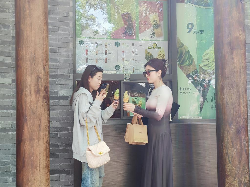 5月8日,位于東四大街的吳裕泰茶莊門口,兩名女士在購(gòu)買冰激凌。新華社記者謝?,?攝