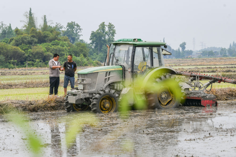 在四川省成都市崇州市大劃街道石橋村,舒星宇(左)在和拖拉機手溝通翻耕土地的要求(5月15日攝)。