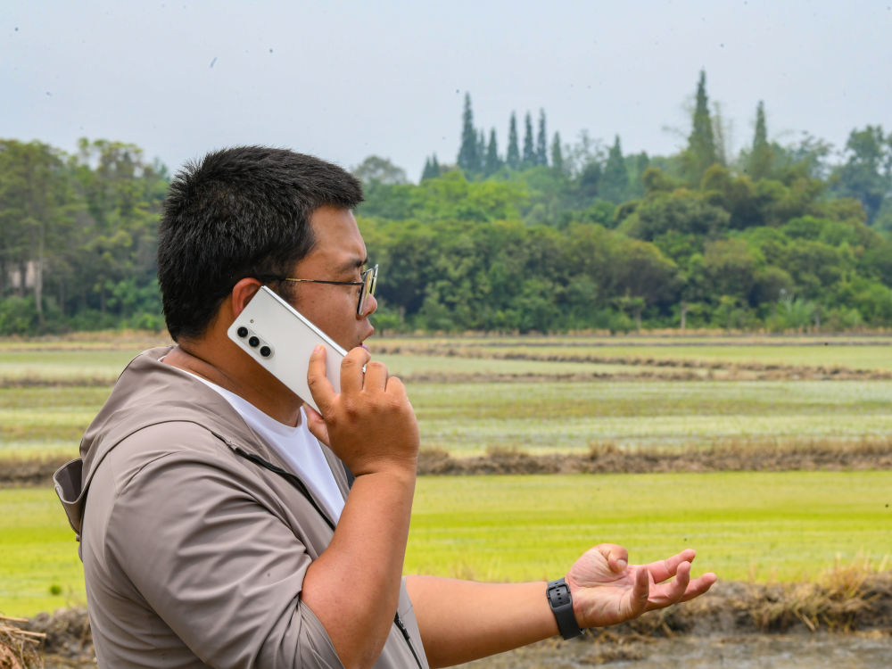 在四川成都崇州市大劃街道石橋村,舒星宇接到種植大戶的電話,溝通農(nóng)機服務(wù)需求(5月15日攝)。