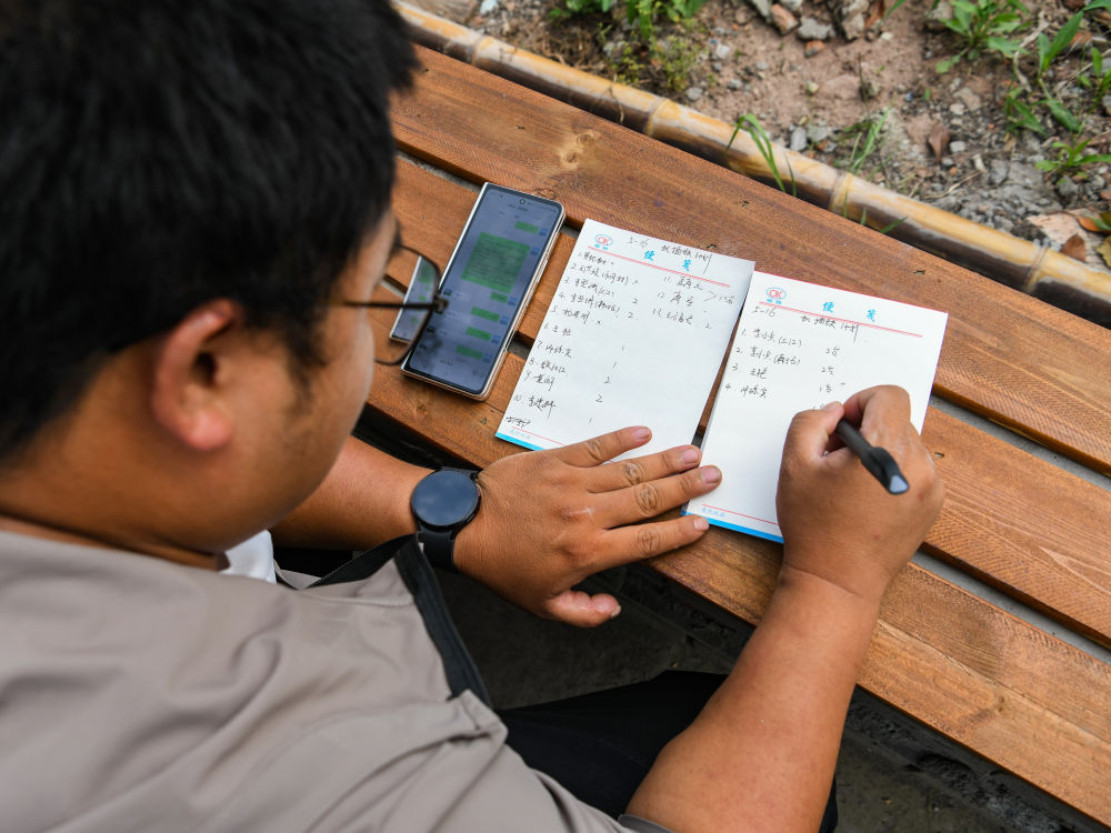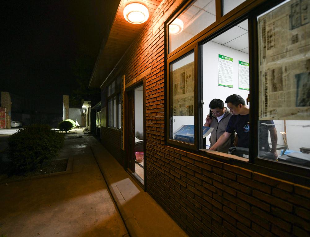 在四川省成都東部新區(qū)董家埂鎮(zhèn)小河村,舒星宇在安排第二天的機插秧計劃(5月15日攝)。