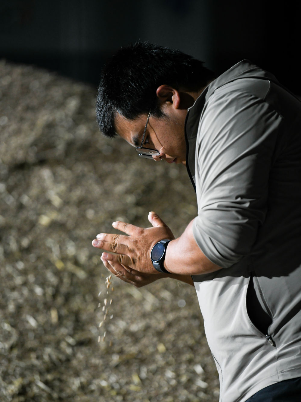 在四川成都崇州市萬茂欣欣農(nóng)機專業(yè)合作社,舒星宇在查看庫房待烘干小麥的情況(5月15日攝)。