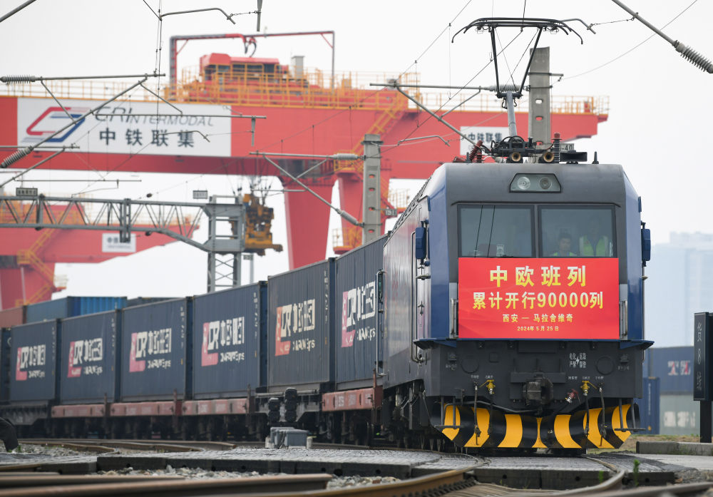 5月25日,X8157次中歐班列從西安國際港站開出,駛向波蘭馬拉舍維奇。新華社記者張博文攝