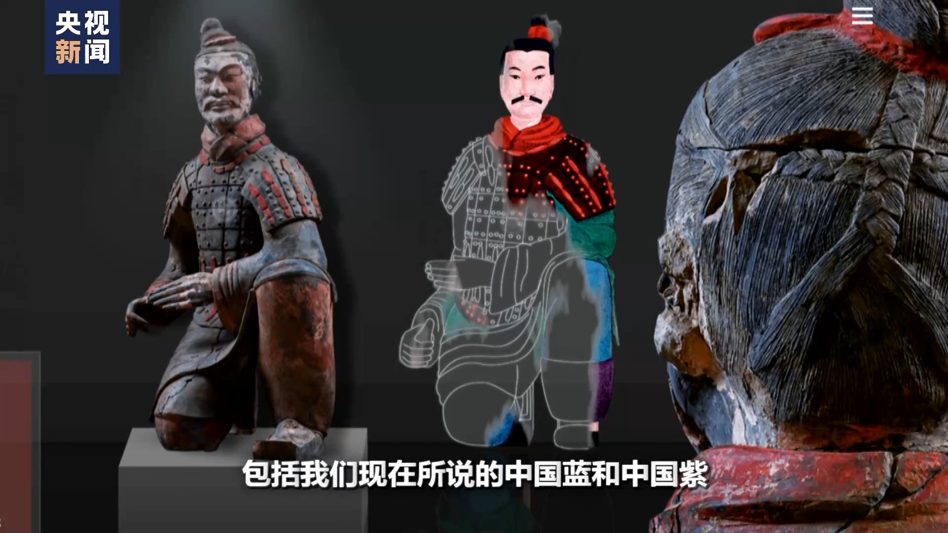 秦始皇帝陵博物院文物保護(hù)修復(fù)專家 蘭德?。?/strong>那么這在秦俑實(shí)際上,目前有八種顏色。紅、黃、綠、藍(lán)、紫、白、黑、粉等等,這就是已經(jīng)定型的八種。但是我們最近也要分析比這個還要多,包括有一些它是白里透紅的粉色,還有的它就是幾種合成色,包括我們現(xiàn)在所說的中國藍(lán)和中國紫。