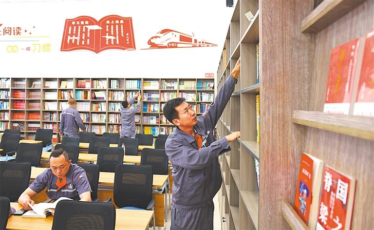 ▲5月28日,中車(chē)長(zhǎng)客職工書(shū)屋,周晶輝國(guó)家技能大師工作室成員利用休息時(shí)間忙“充電”。