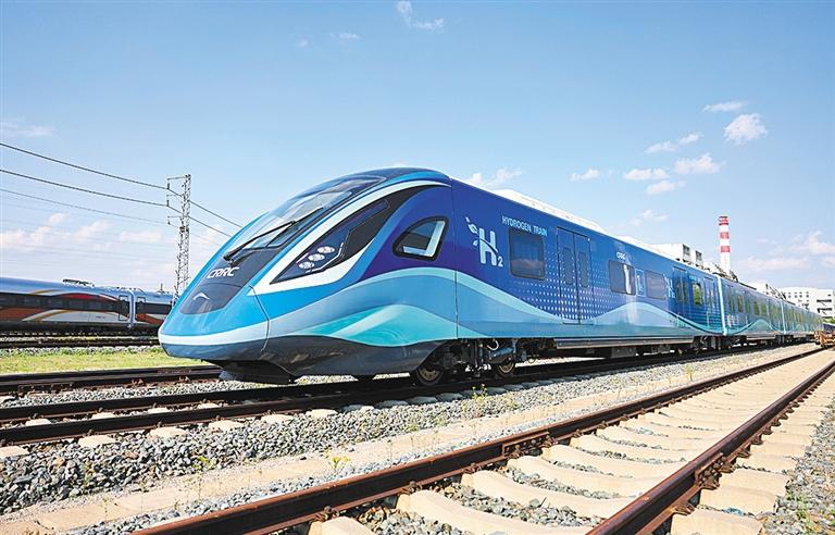 ▲5月28日,中車(chē)長(zhǎng)客研制的全國(guó)首列氫能源市域列車(chē)。該車(chē)已于近期成功完成達(dá)速試跑,標(biāo)志著氫能在軌道交通領(lǐng)域的應(yīng)用取得歷史性突破。