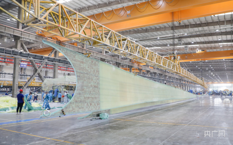 6條百米級及以上葉片生產(chǎn)線上,一個超百米長的“裸裝“風(fēng)力發(fā)電葉片放置車間中央,靜待技術(shù)人員“美顏”包裝。自主研制的陸上超大型玻纖葉片便是從這里運(yùn)往沙漠、戈壁、荒漠地區(qū)。