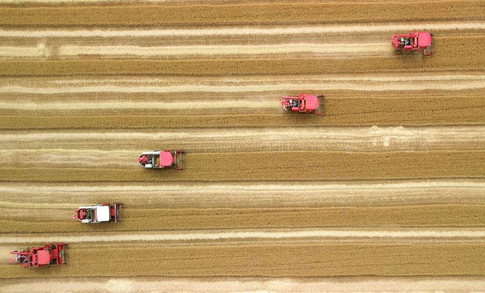麥浪翻滾,沃野生金。麥田中,10臺收割機依次排開;一聲令下,農機手駕駛收割機勻速前行,風中搖曳的麥穗被吸入“腹中”,田間只剩下短短的麥茬。