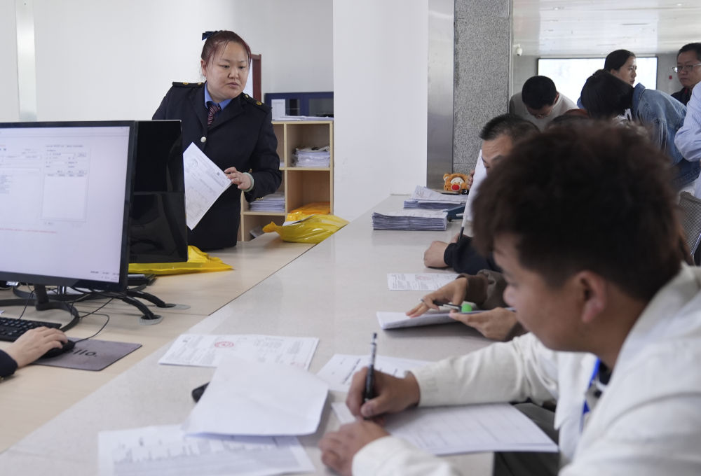 在霍爾果斯鐵路口岸站聯(lián)運(yùn)大廳內(nèi),出口貨運(yùn)員在為客戶辦理更正國際聯(lián)運(yùn)運(yùn)單業(yè)務(wù)(5月29日攝)。