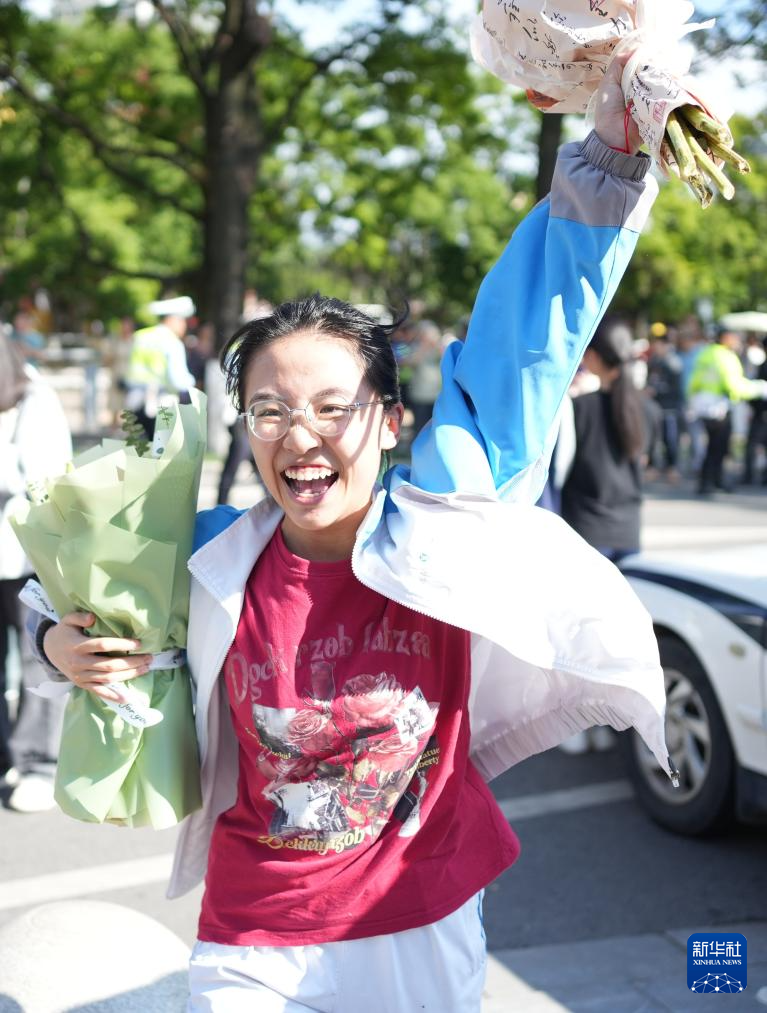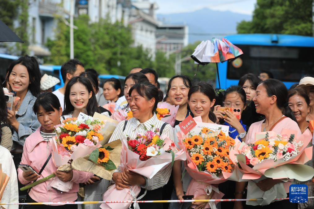 6月8日,在云南省昆明市第五中學(xué)考點,考生手持鮮花慶??荚嚱Y(jié)束。新華社發(fā)(張正舉攝)