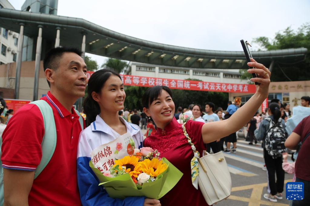 6月8日,在云南省水富市云天化中學(xué)考點,家長和考生合影。新華社發(fā)(狄廷秀攝)