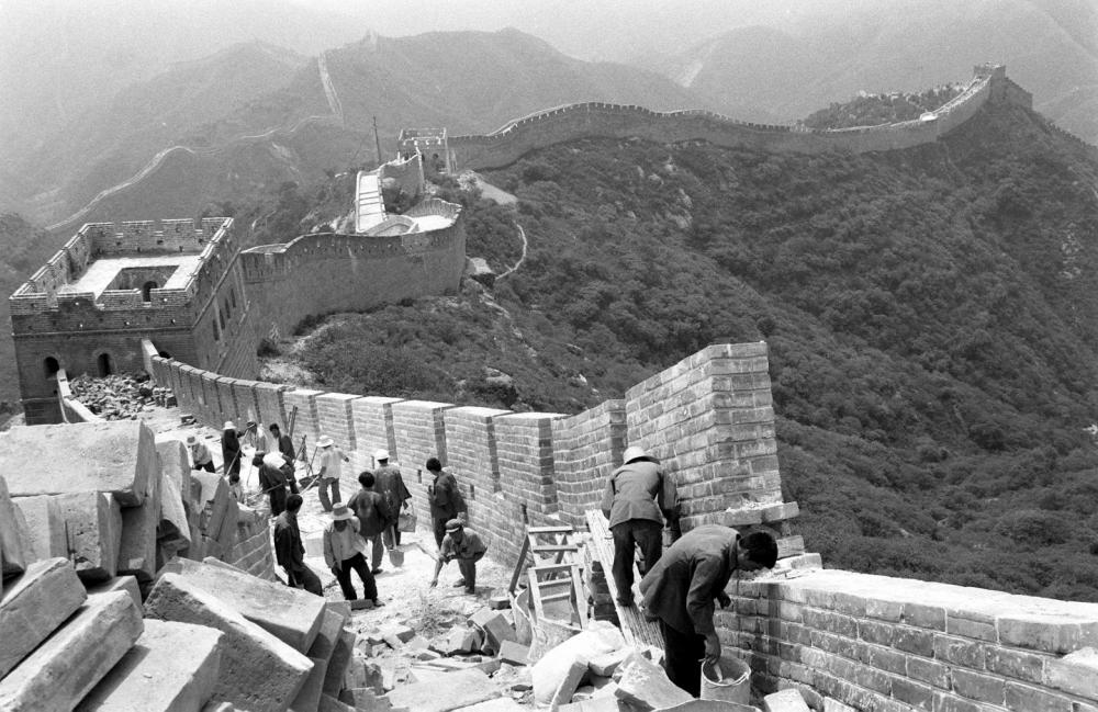 工人正在修復(fù)北京八達嶺長城的一段城墻。這是用由北京晚報、八達嶺特區(qū)辦事處等單位聯(lián)合發(fā)起“愛我中華 修我長城”社會贊助活動所獲款項進行修復(fù)的第一期工程 (資料照片,1984年8月11日發(fā))。新華社記者 袁汝遜 攝