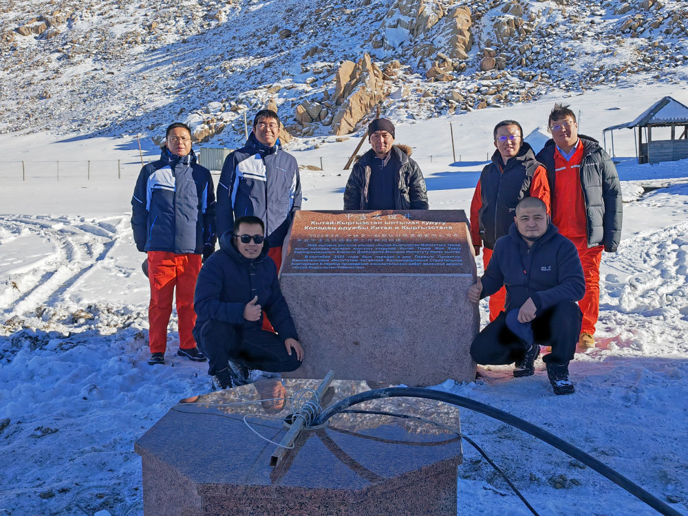 執(zhí)行中吉烏鐵路可行性研究的中鐵第一勘察設計院專家團隊成員在吉爾吉斯斯坦納倫州的“中吉友誼井”(前)和紀念石碑旁合影(2022年11月26日攝)。新華社發(fā)(中鐵第一勘察設計院供圖)
