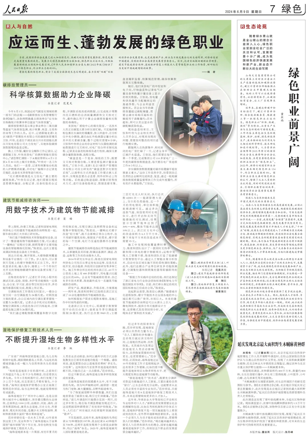 蓬勃發(fā)展的綠色職業(yè),契合了我國全面推進生態(tài)文明建設(shè)、奮力實現(xiàn)“雙碳”目標的經(jīng)濟社會發(fā)展需要,也是我國新產(chǎn)業(yè)、新業(yè)態(tài)不斷發(fā)展壯大的生動寫照,對推動美麗中國建設(shè)、實現(xiàn)經(jīng)濟社會高質(zhì)量發(fā)展有重要意義。近日,人民日報記者實地探訪碳排放管理員、建筑節(jié)能減排咨詢師、濕地保護修復工程技術(shù)人員等綠色職業(yè)的工作場景,傾聽他們?yōu)槊利愔袊鴾p碳增綠的故事。
