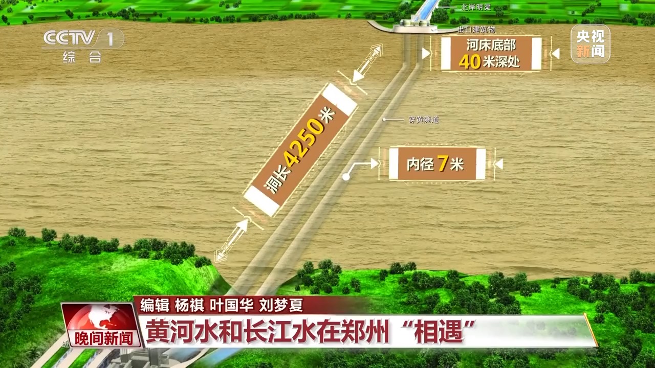 南水北調(diào)工程建設(shè)者在鄭州花園口西黃河河床底部40米深處開鑿兩條隧道,穿黃隧道為雙線有壓輸水隧道,單個洞長4250米,內(nèi)徑7米,這樣的內(nèi)徑可以滿足洞內(nèi)跑汽車。有了“穿黃工程”,北上的長江水通過兩條穿黃隧道與黃河立體交叉相遇。平時,黃河水在上面流,南水北調(diào)的長江水在河底隧道中流過,兩者上下而過,猶如一條巨龍在黃河之下隱去了身影。