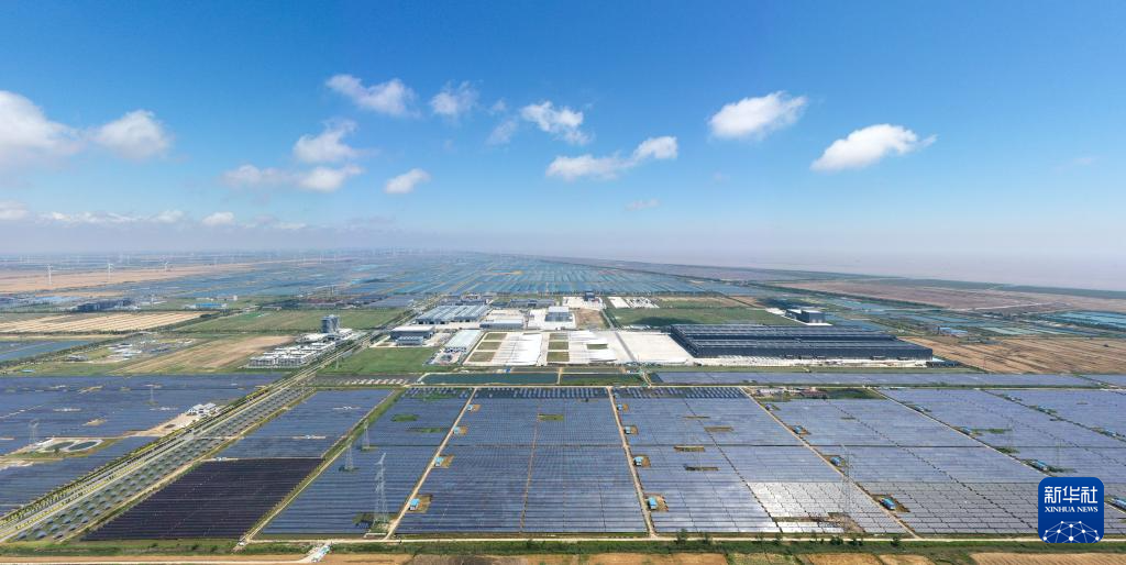 6月6日在射陽港低(零)碳產業(yè)園拍攝的長廊頂部太陽能光伏系統(tǒng)(無人機照片)。新華社記者 楊磊 攝