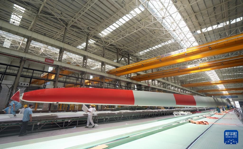 6月6日,在射陽中車風電葉片工程有限公司生產車間拍攝的大型風機葉片。新華社記者 李尕 攝