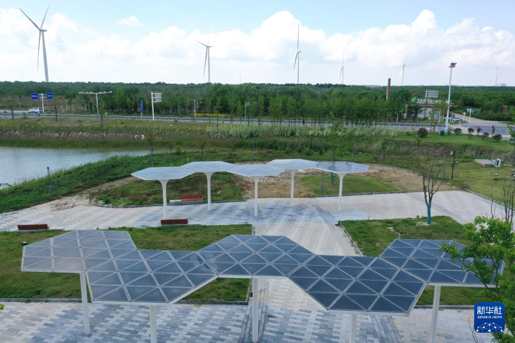 6月6日拍攝的射陽港低(零)碳產業(yè)研究院建筑屋頂使用的太陽能光伏電能系統(tǒng)(無人機照片)。新華社記者 楊磊 攝